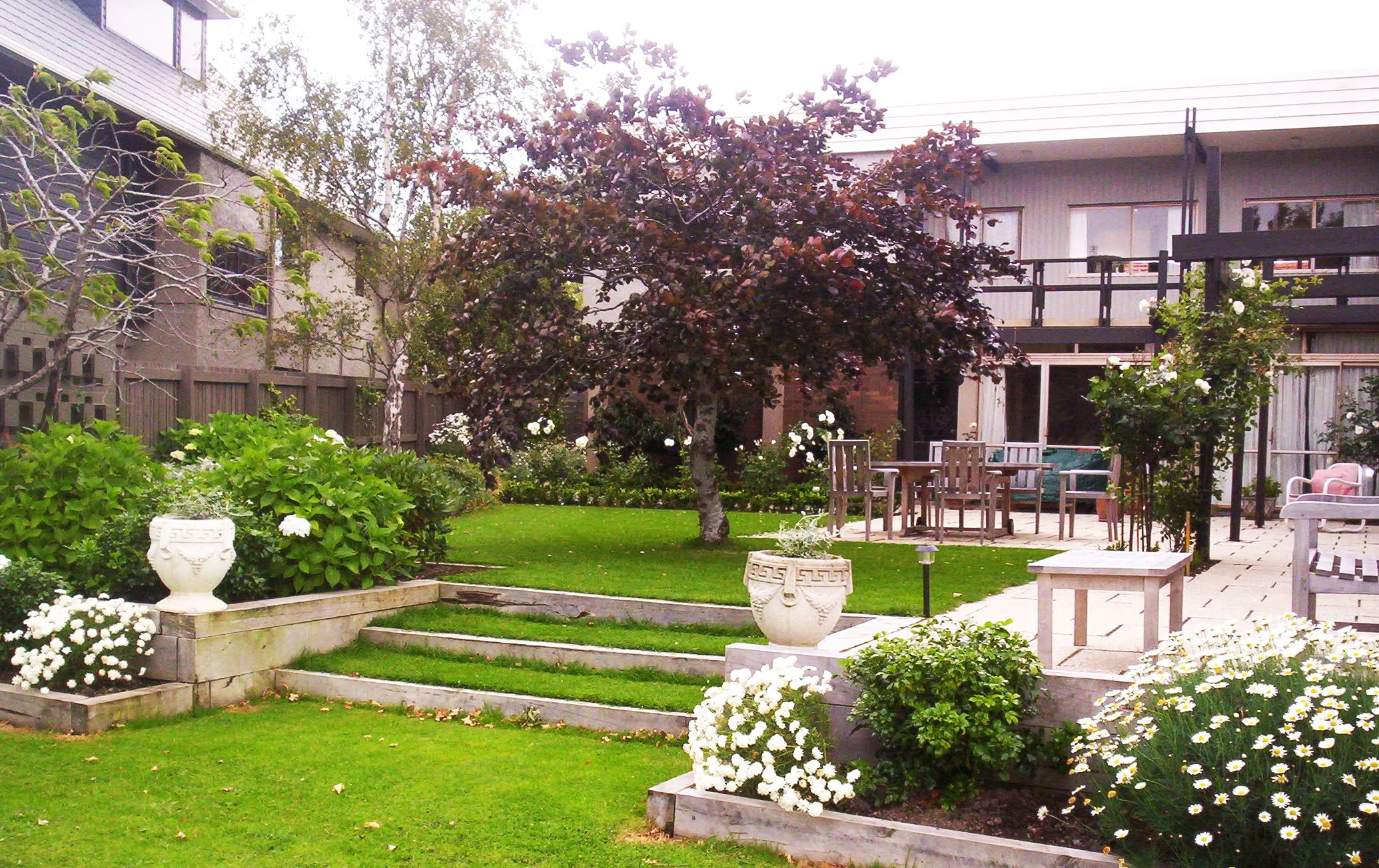 My first view of the garden vista to the golf course behind, gave me all the inspiration I needed and I started with broad grassed steps and retaining wall level with their lawn. This gave the illusion of the back lawn blending with the golf course and a ‘borrowed vista’ gave the wow factor for this garden.